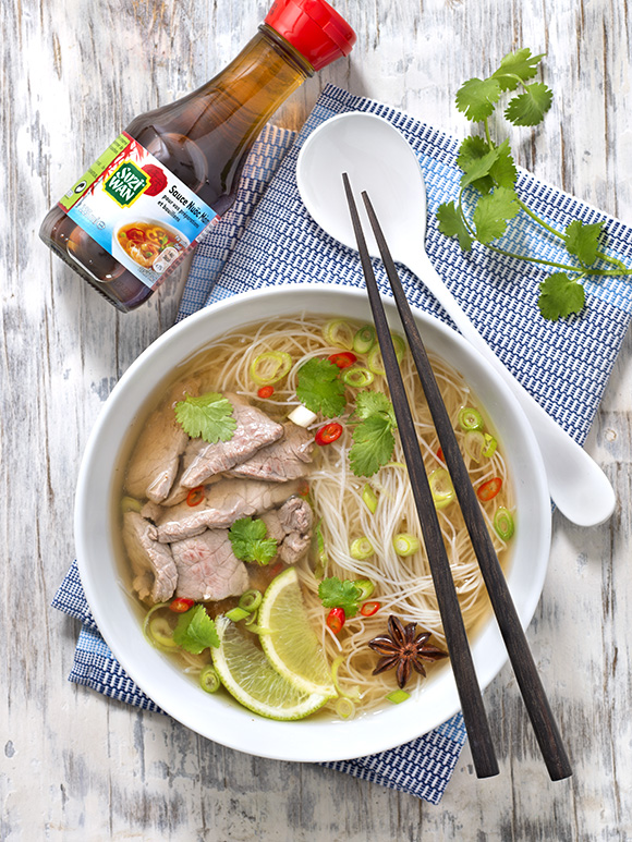 La soupe Phở bò est une spécialité originaire du Vietnam servie dans de grands bols asiatiques.