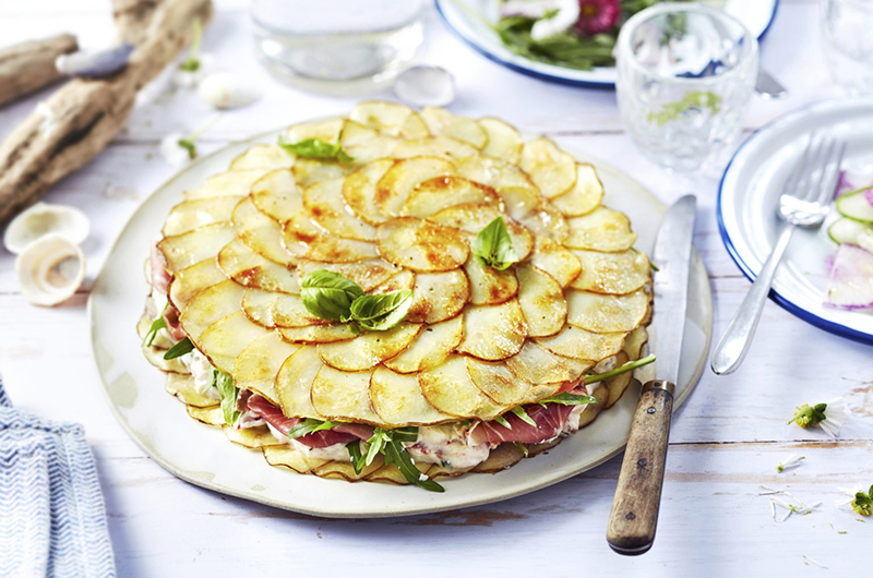 Une fine galette dorée garnie de pommes de terre fondantes, ricotta crémeuse, tomates confites, basilic frais et jambon de Parme pour une escapade gourmande aux accents italiens.