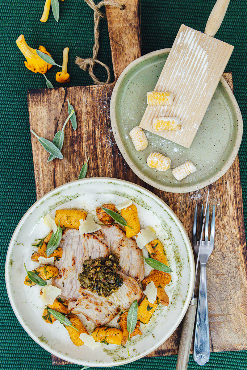 Servir les escalopes et leur sauce accompagnées des gnocchis. Parsemer de lamelles de Cantal.