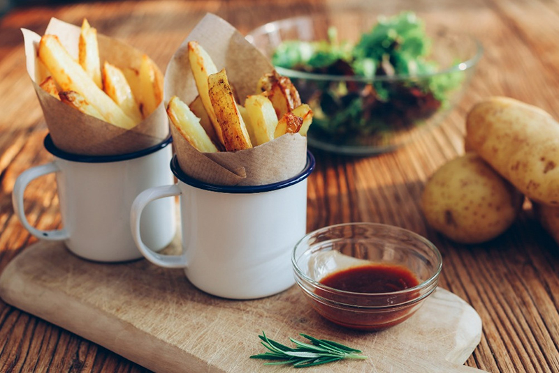 Après avoir été pelées puis rincées, les pommes de terres sont coupées en deux dans leur longueur. Chaque moitié est ensuite tranchée en lamelles et taillée en allumettes ou en bâtonnets, de 1 à 2 cm. Pour gagner du temps, les petits malins pourront s’équiper d’un coupe-frite. Dernière étape de cette préparation sur-mesure : rincer rapidement les frites à l’eau froide, avant de les sécher soigneusement dans un torchon propre.