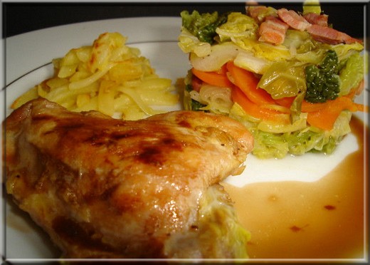 2/Dans une cocotte, mettre le beurre et les tranches de lard, Y faire revenir la pintade; dès qu'elle est dorée, saler, poivrer, ajouter le chou coupé en gros quartiers, les carottes en rondelles, l'oignon et le bouquet. Mouiller avec le vin blanc.