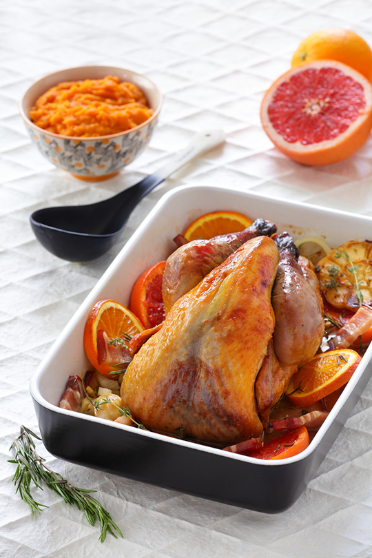 Pintade Fermière Label Rouge à l’écrasé de carottes, aux agrumes et au lard