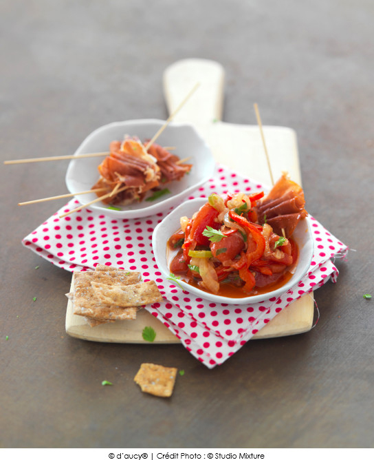 Au moment de servir, rectifiez l’assaisonnement et agrémentez des lanières de jambon montées en brochettes.