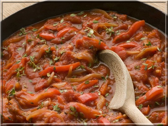 • Remuer souvent et couvrir afin d’accélérer la cuisson. Lorsque l’oignon est bien blond, ajouter les tomates, l’ail et les herbes. Saler, poivrer, ajouter un peu de piment ; ne pas oublier de sucrer légèrement car la tomate est acide. Couvrir.
