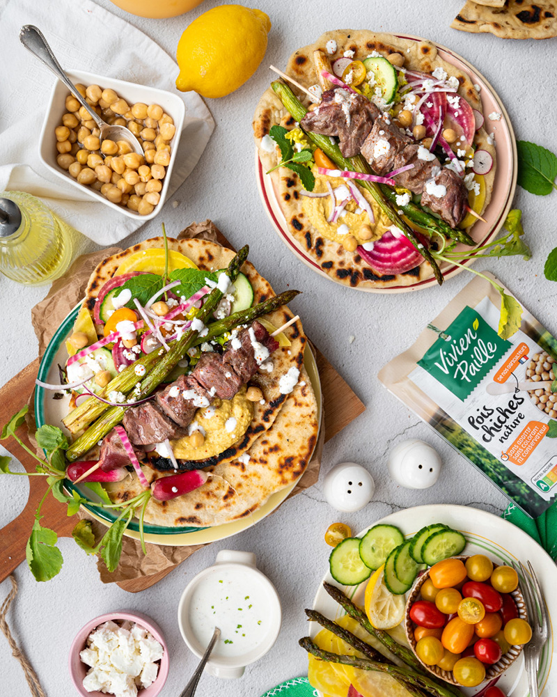 ⑦• Pour le dressage, sur chaque pain, déposer une généreuse couche de houmous, répartir les crudités, compléter avec les asperges grillées, les brochettes, 2 cuillères à soupe de pois chiches, la feta émiettée, la sauce au yaourt, des herbes fraîches ciselées, un filet d’huile d’olive, du sel, du poivre, et éventuellement un peu de piment et de jus de citron.