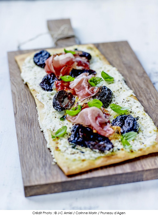 Pizza au speck, chèvre frais et Pruneau d’Agen IGP mariné au basilic frais