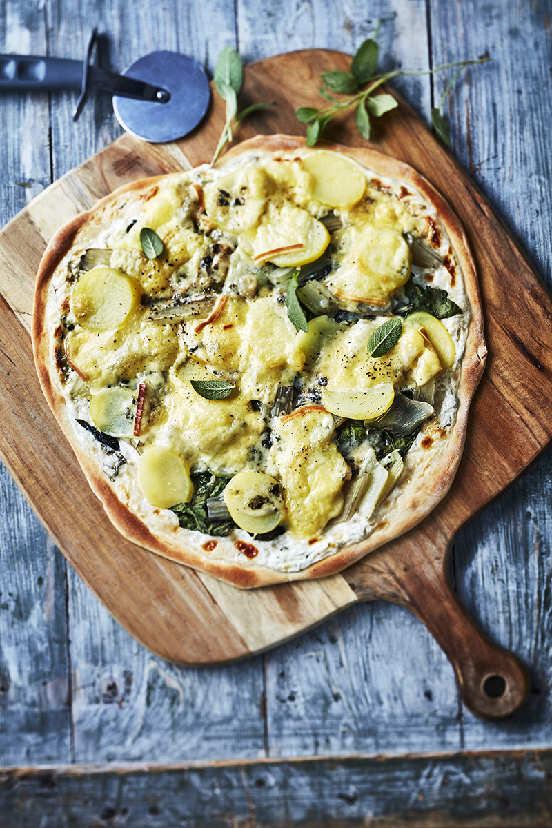 Pizza aux pommes de terre, blettes, raclette fumée et crème au bleu