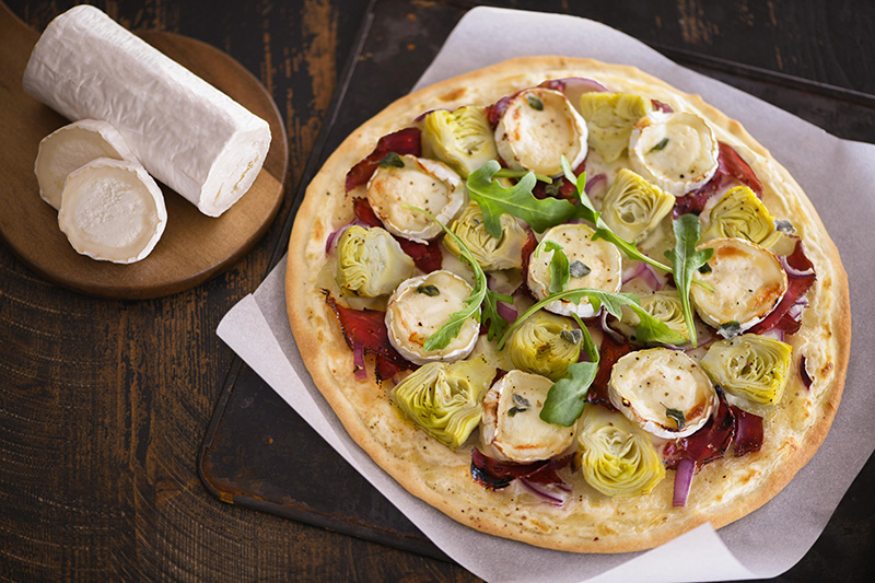 Pizza blanche aux artichauts marinés et bûchette de chèvre affinée