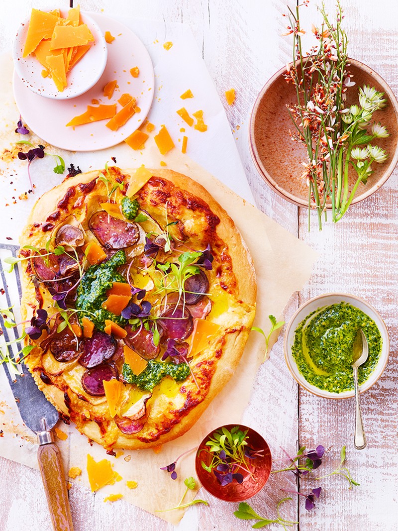 Sortez les pizzas du four, arrosez de pesto, ajouter des copeaux de mimolette et servez sans attendre.