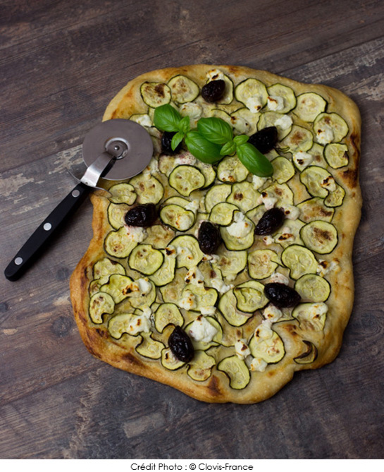⑩• Disposer de très fines rondelles de courgettes, répartir de petits morceaux de fromage de chèvre frais et les olives noires.