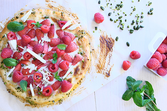 Pizza dessert, vanille, fruits rouges