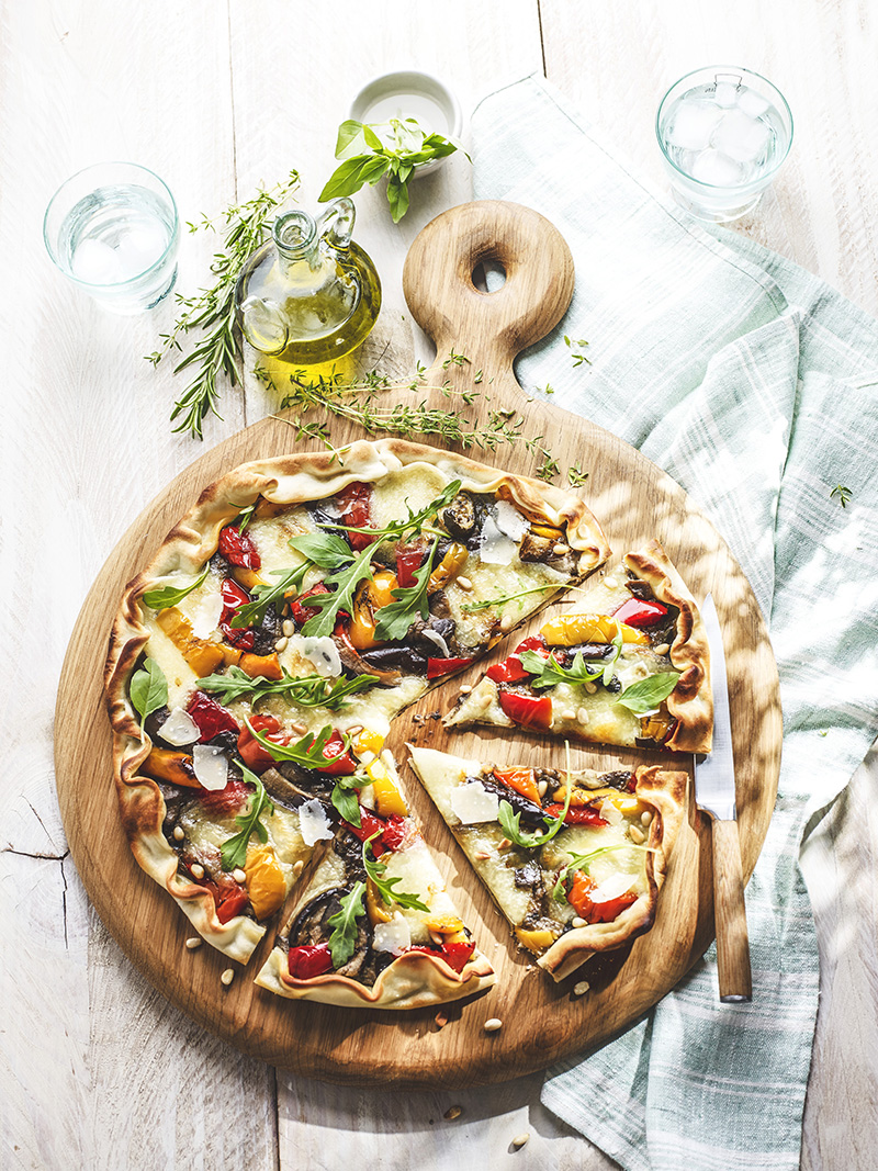 ③• Tartinez la pâte avec le confit d’aubergine, répartissez dessus les légumes grillés et la mozzarella en tranches épaisses.