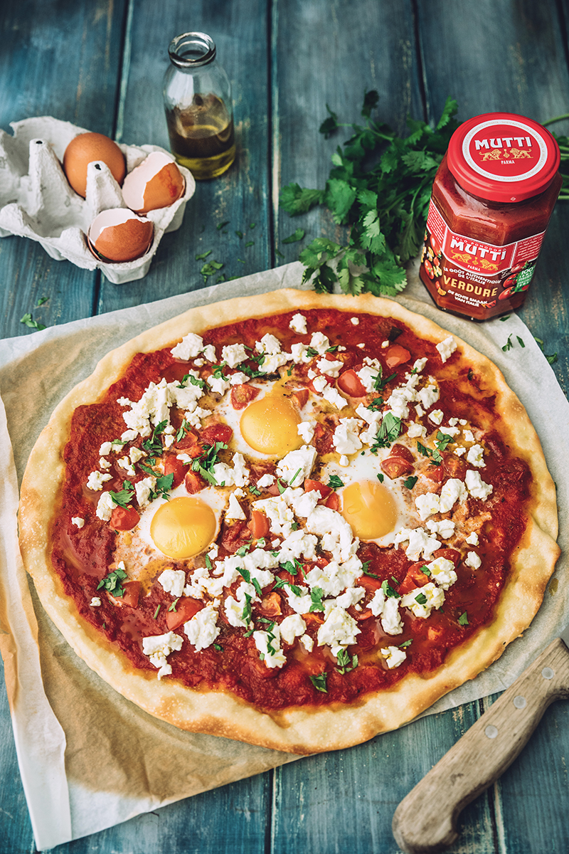 ③• Couper la feta en petit dès. Étaler sur la pâte la sauce tomate aux légumes grillés Mutti et ajouter les œufs cassés, puis la feta. Saler, poivrer et ajouter un filet d’huile d’olive.