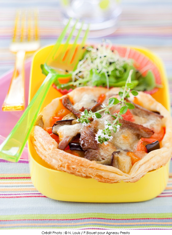 ⑥• Disposer les légumes et les émincés d’agneau sur les ronds de pâte feuilletée puis ajouter des morceaux de mozzarella.