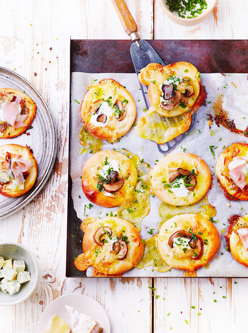 ③• Pour les pizzettes champignon-camembert : mélangez la crème avec l’huile de truffe, une pointe de sel et du poivre, étalez l’équivalent d’½ cuil. à café de ce mélange sur la moitié des ronds de pâte. Ajoutez quelques dés de camembert et des lamelles de champignons.