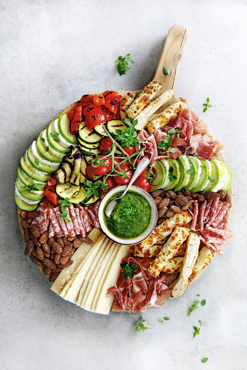 ⑥• Coupez la focaccia ou la ciabatta en morceaux. Disposez la focaccia, le parmesan, le jambon de Parme, la spianata romana, les légumes grillés et les tomates cerises sur le plateau. Ajoutez le bol de pesto.