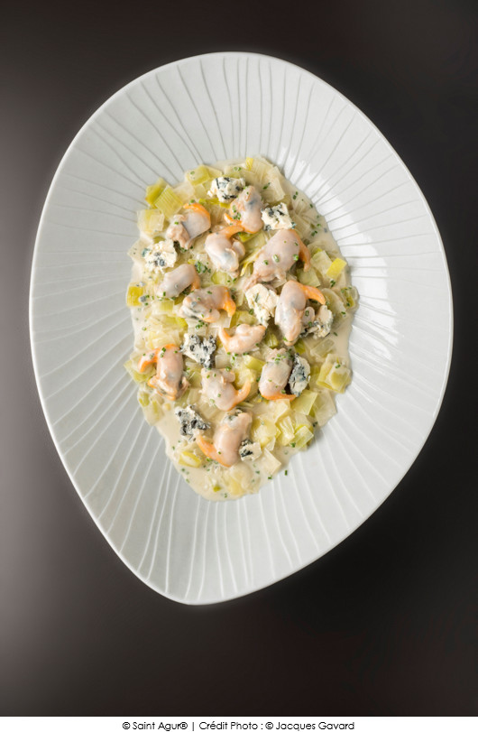 Poêlée de coques, Saint Agur®, poireaux au raifort