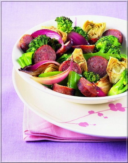 Quand ils commencent à être translucides, monter le feu et ajouter le brocoli, les pois gourmands, les cœurs d’artichaut et les saucisses. Faire sauter 10 min tout en remuant avec une spatule. Ajouter le filet de vinaigre, saler, poivrer et server aussitôt.