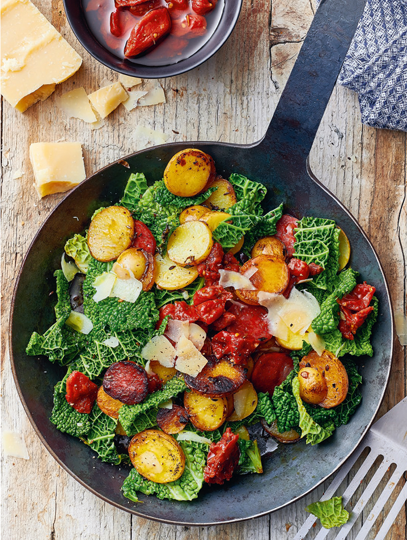 Poêlée de pommes de terre, chou frisé, chorizo et Sbrinz AOP