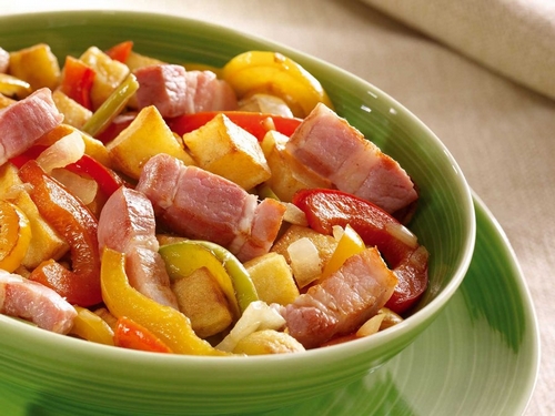 4.Dans la même poêle, faites dorer les oignons et les dés de pommes de terre avec l'huile d'olive. Puis ajoutez les poivrons et les lardons et faites cuire l'ensemble 5 minutes. Salez avec modération et Poivrez.