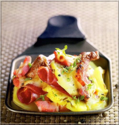 5- Disposez les pommes de terre, le magret cru et fumé, la coppa avec les oignons et les lardons dans 8 petits poêlons.