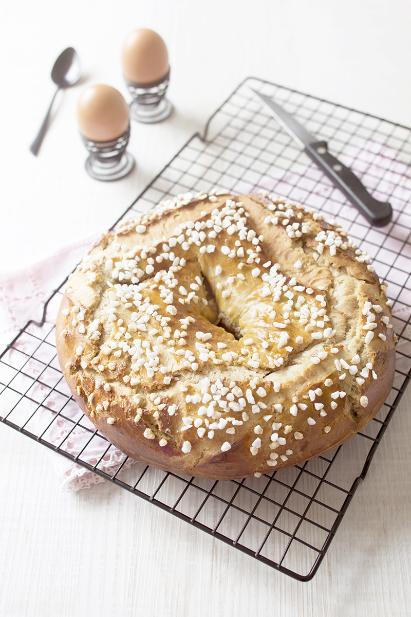④• À l’aide d’un pinceau, dorez la brioche avec le jaune d’œuf dilué dans 2 cuillerées à café d’eau.