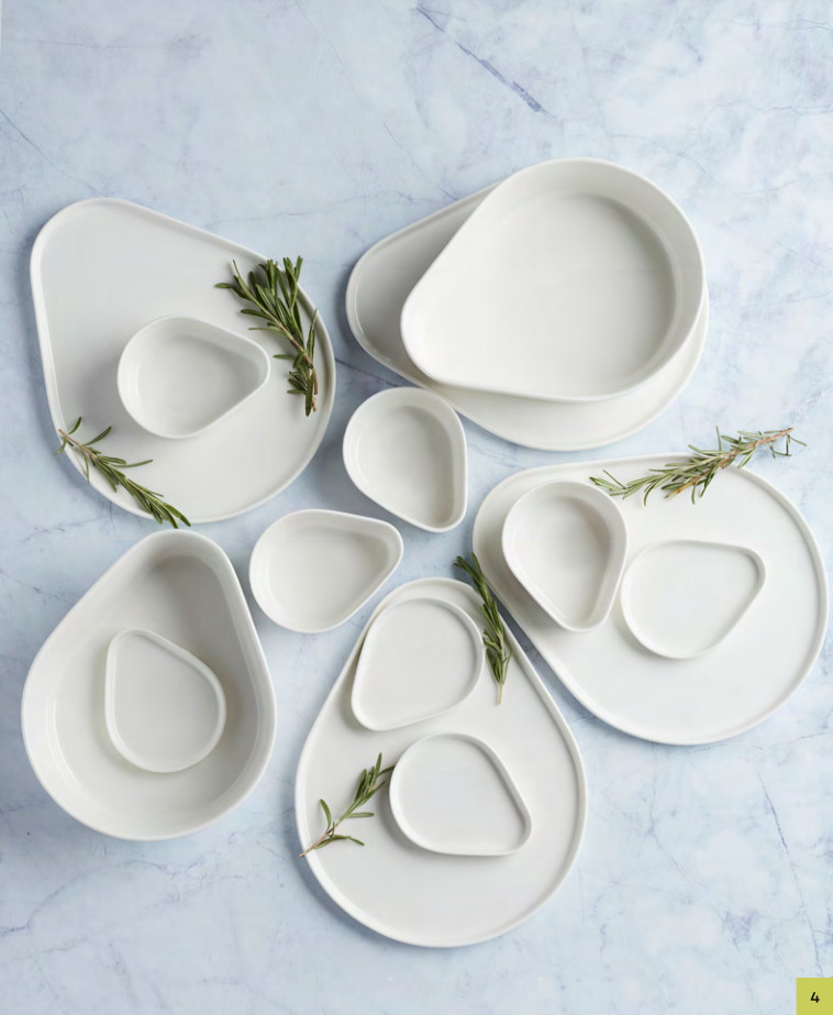 La collection MOMENTS est composée de plats et d’assiettes en porcelaine, matériau intemporel et résistant, de sets de table et de sous-verres en cuir synthétique et de planches en bois d’acacia. Elle évolue autour d’une forme unique : une simple goutte d’eau qui permet de dresser des tables contemporaines épurées.