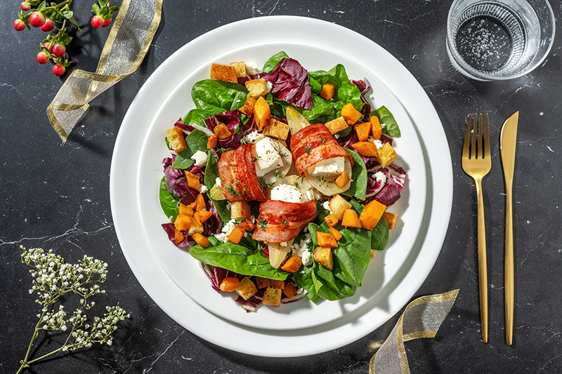 Cette recette étonnante associe le fondant de la poire farcie au fromage de chèvre, le tout enlacé par une tranche de poitrine de lard fumée croustillante. Sur son lit de salade agrémentée de butternut et de noix, les convives sont sûrs de fondre de gourmandise.