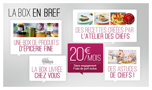 Eat your Box est la première Box culinaire en France ! Pour 20 euros par mois, vous recevez un colis au contenu surprise de 7 à 9 produits culinaires originaux, rassemblés autour d’un thème dévoilé à l’avance. Chaque Box est également accompagnée d’un livret de recettes, élaborées par L’atelier des Chefs, afin de vous donner des idées pour utiliser chaque produit de la Box !