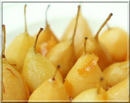 1.Pelez les poires en gardant la queue et arrosez-les de jus de citron vert.