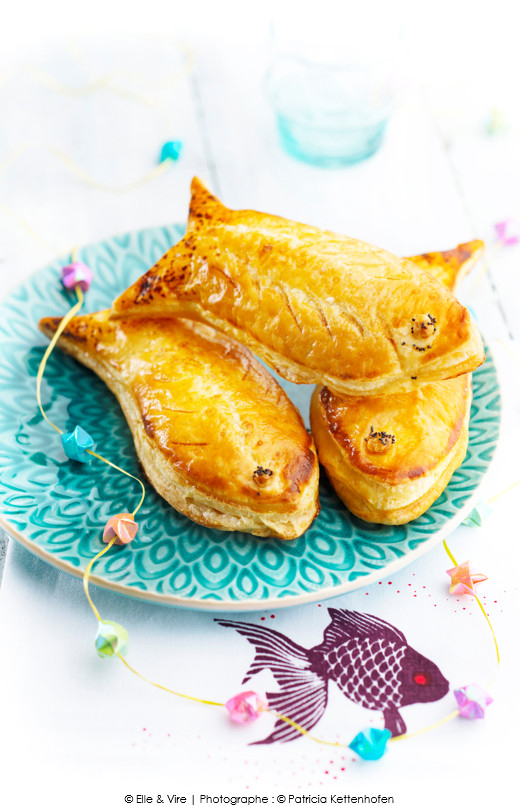 ②• Dérouler une des deux pâtes feuilletées et découper 4 à 6 poissons à l’aide de l’emporte-pièce. Disposer la préparation épinard/saumon au centre des poissons puis humidifier les contours avec un peu d’eau. Sur la seconde pâte feuilletée, former le même nombre de poissons avec l’emporte-pièce puis placer les formes sur les premiers poissons en appuyant sur les contours pour bien coller les pâtes entre elles.