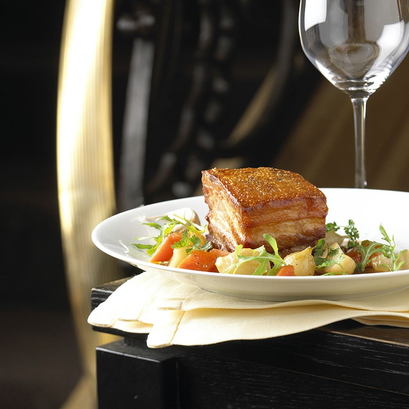 Poitrine de porc croustillante et légumes en cocotte