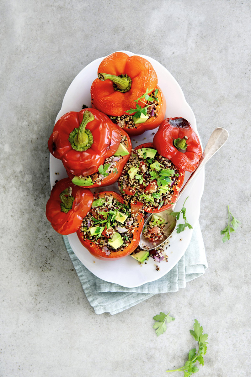 ⑥• Couper les chapeaux des poivrons, retirer les graines, puis les farcir avec le mélange quinoa-avocat.
