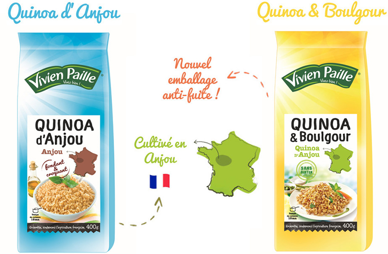 Spécialiste des produits essentiels de l’épicerie salée tels que les légumes secs et le riz, Vivien Paille commercialise également 2 références avec du quinoa français cultivé en Anjou : un quinoa blond d'Anjou et un mélange quinoa blond d'Anjou, quinoa rouge et boulgour.