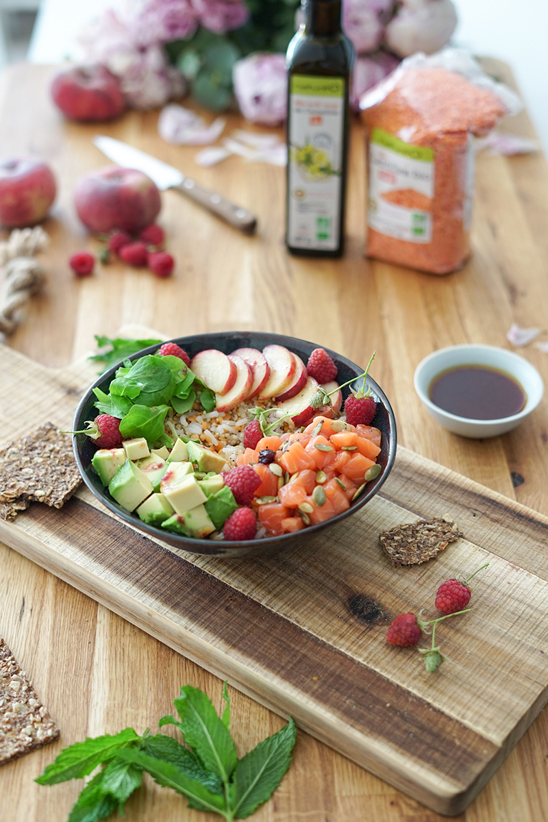 En ce mois de juillet, quoi de mieux qu'une recette saine et rafraîchissante pour rythmer nos envies de sucré-salé ? C'est ce que nous propose naturéO avec son Poke Bowl au saumon composé de légumineuses et fruits frais de saison.