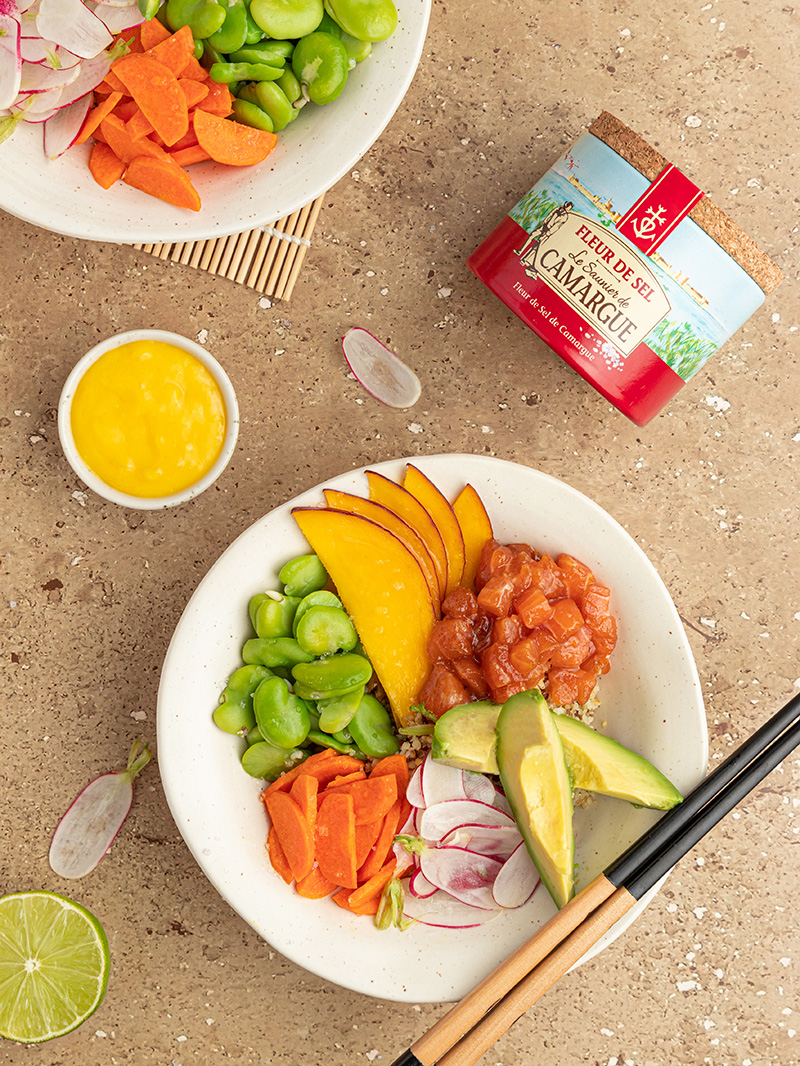 Terminer en saupoudrant le bol d’un peu de Fleur de sel Le Saunier de Camargue pour assaisonner les légumes et dresser la sauce à part.