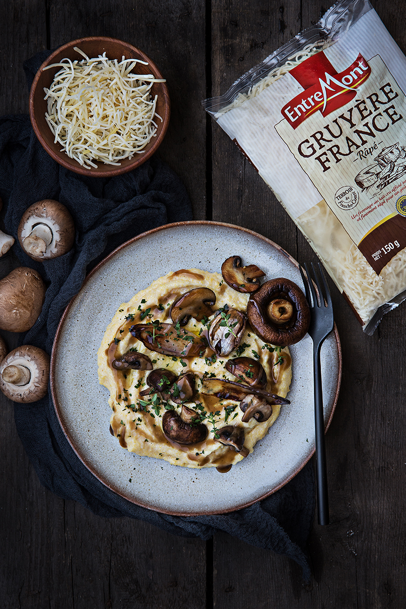 Polenta crémeuse au Gruyère France IGP râpé Entremont et champignons poêlés