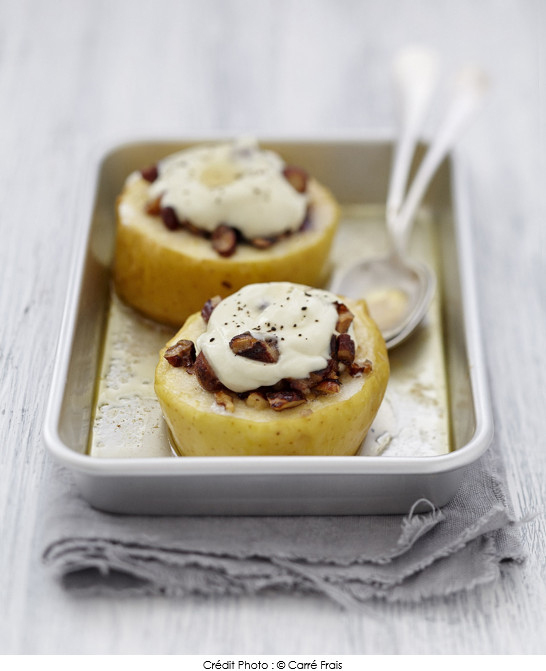 Sortez les pommes du four, déposez une grosse cuillère de carré frais sur chaque pomme, et servez aussitôt.