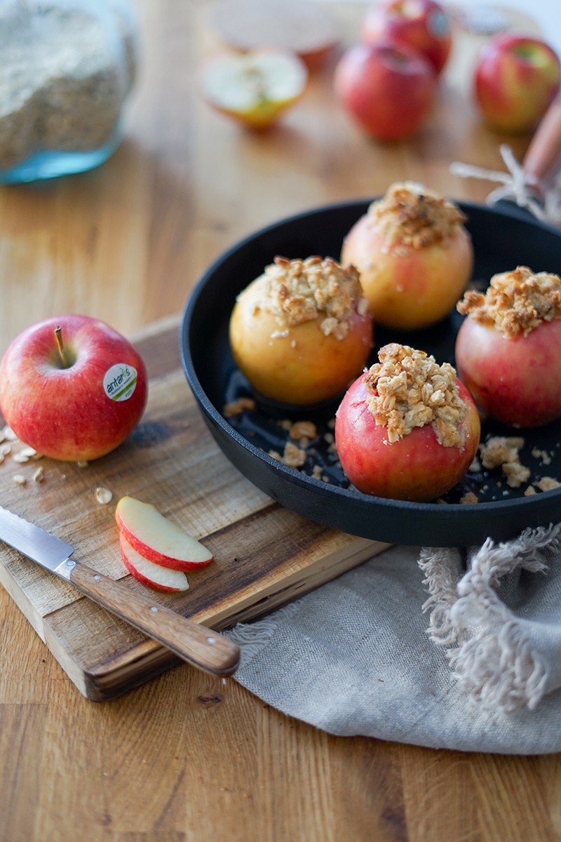 ④• Parsemez de crumble sur chaque pomme. Enfoncez une petite partie de ce crumble au centre de chaque pomme.