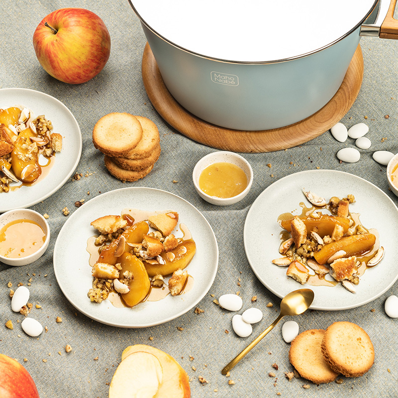 ①• À feu très doux pendant quelques minutes, monter en température votre Maho Nabé. Déposer dans le Maho Nabé un copeau de beurre salé et le laisser fondre tranquillement. Déposer la pomme coupée en 8 quartiers et la laisser caraméliser avec le miel. Le beurre doit rester à un stade noisette.