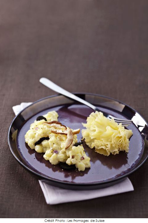 5• Dans quatre assiettes, disposer les pommes de terre façon risotto. Parsemer de fins copeaux de truffe et terminer avec de fines Rosettes de Tête de Moine AOC et quelques copeaux de champignons à cru.