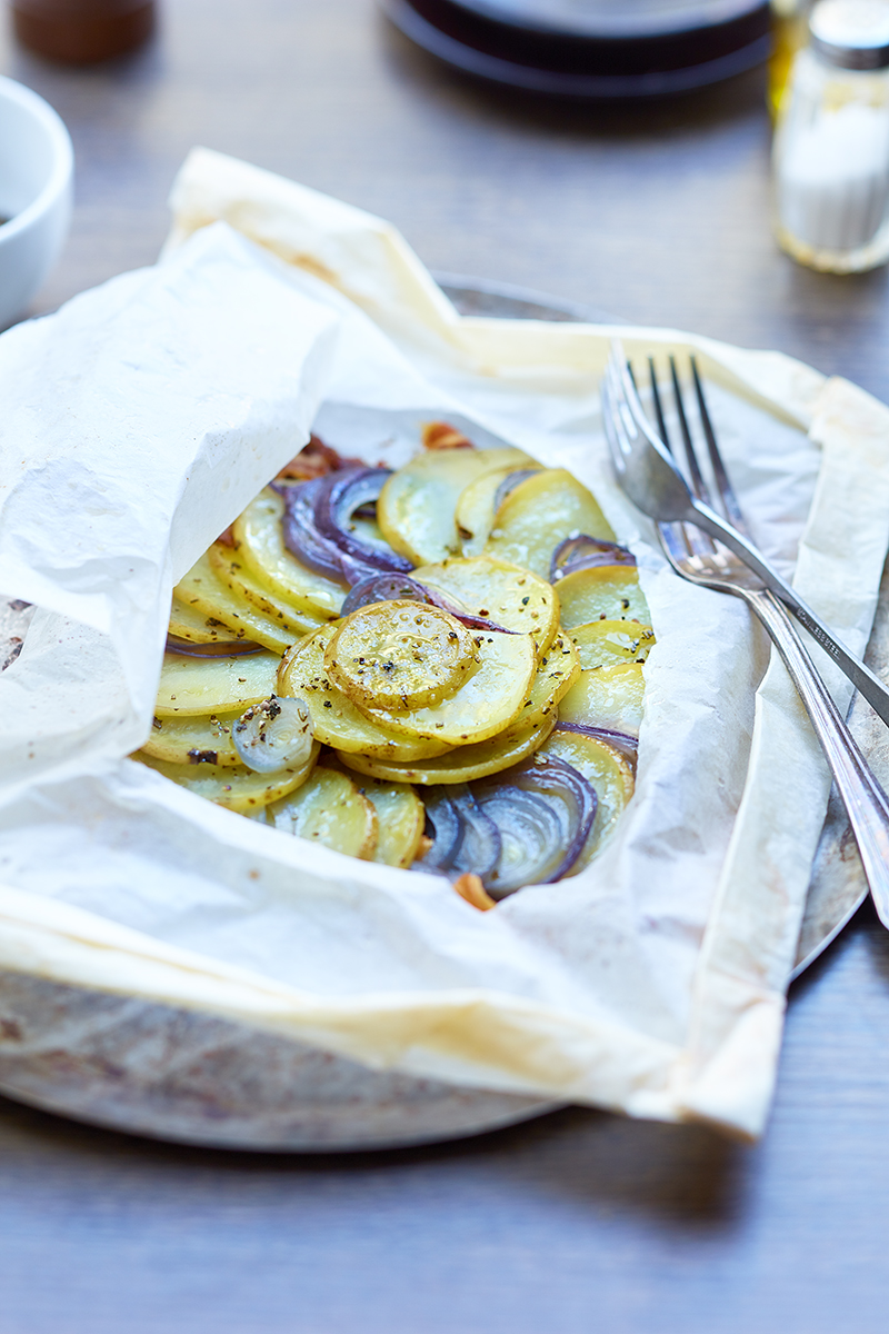 Pommes de terre de primeur en papillote au lard paysan et à l’oignon rouge
