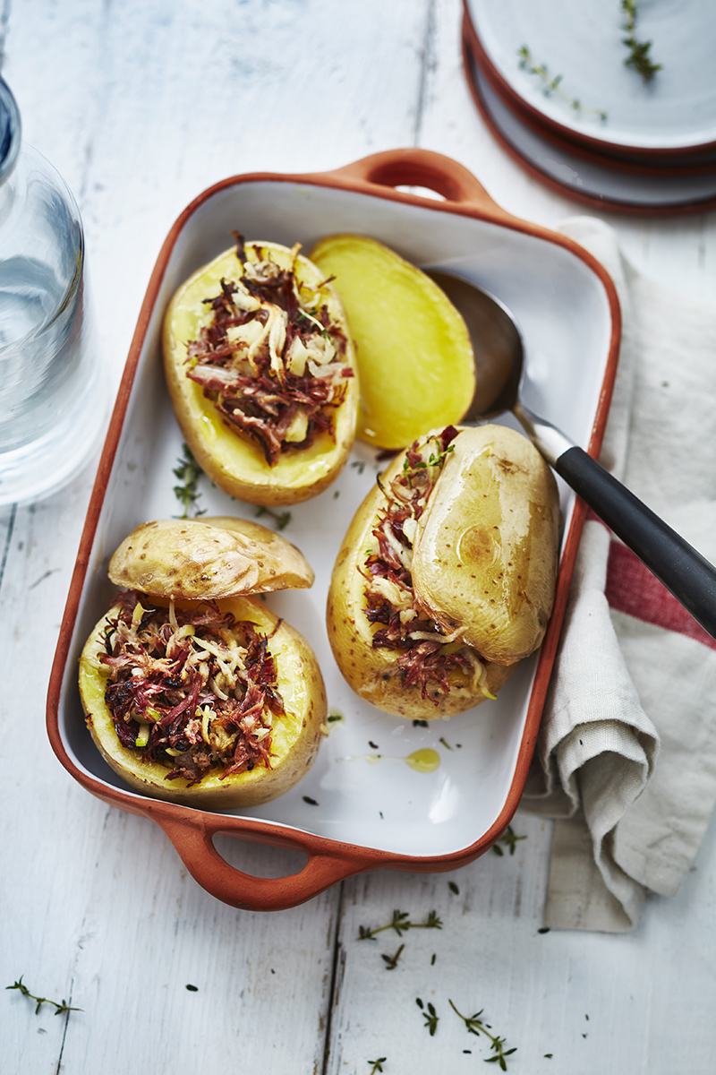 Pommes de terre farcies à l’effiloché de canard et pomme verte