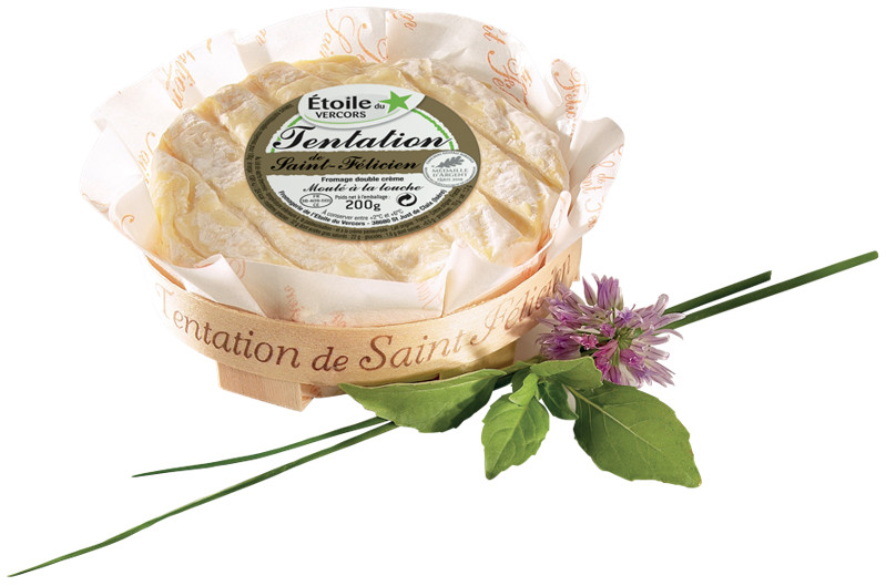 Fromage de terroir, généreux et extrêmement fondant, le Tentation de Saint Félicien est recouvert d’une fine croûte ivoire à l’aspect légèrement ridé. Le Tentation de Saint-Félicien est un fromage au lait thermisé de vache à pâte molle et à croute fleurie. Caractérisé par son double crème et sa saveur délicate de noisette, le Tentation de Saint-Félicien peut voir son goût s’accentuer ou s’adoucir, en fonction de sa durée d’affinage, entre 10 et 21 jours. Le Tentation de Saint- Félicien étant moulé à la louche, une attention particulière est apportée à chaque fromage. Ces caractéristiques font de lui un produit laitier unique, doublement crémeux, pour un intense moment de plaisir et de gourmandise !