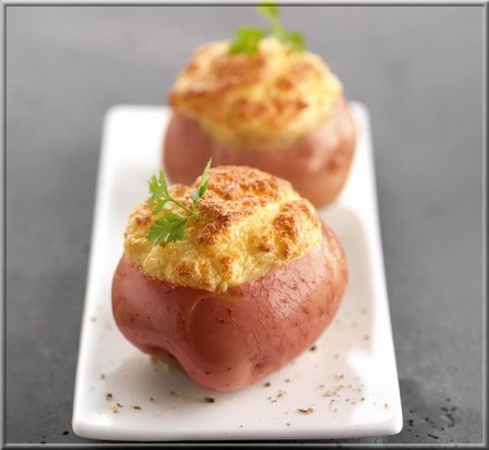 2- Fouettez les blancs d'œufs en neige, mélangez les à la préparation. Remplissez les pommes de terre avec la préparation, mettez-les dans un plat à cuire 10 minutes au four préchauffé thermostat 7. Les pommes de terre doivent gonfler légèrement comme des soufflés.