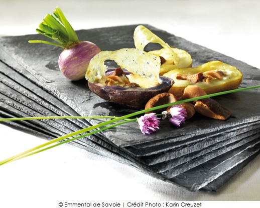 5• Coupez les pommes de terre en 2 et évidez-les en gardant suffisamment de chair pour qu’elles tiennent. Garnissez-les avec des cèpes poêlés, 1 lamelle d’Emmental de Savoie, et un peu de sauce.