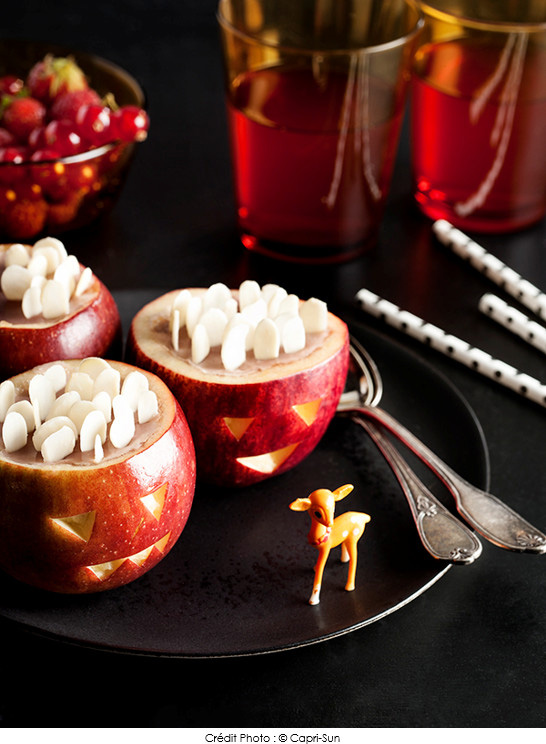 ⑥• À l’aide de la pointe d’un couteau ou d’un évideur, coupez le haut des quatre pommes et évidez-les. Creusez des trous pour former des yeux et une bouche, comme sur une citrouille.