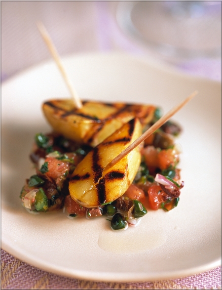 Piquer les pommes de terre d’un pic en bois et arroser avec l’huile composée.