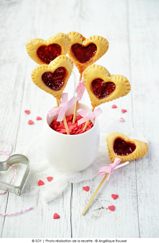 – Fariner un plan de travail et abaisser la pâte au rouleau. Découper des cœurs à l’aide d’emporte-pièces. Évider le centre de la moitié des cœurs avec un emporte-pièce plus petit.