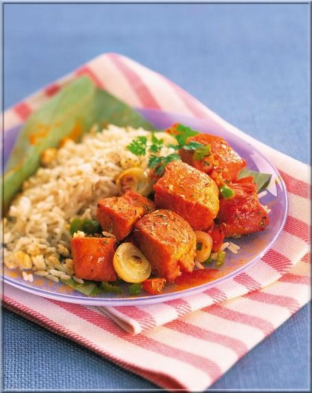 2- Lorsqu’ils ont pris une belle couleur, faire revenir la viande et l’oignon 3 min dans l’huile. Ajouter le thym, les tomates coupées en petits dés, le curcuma puis les piments et l’ail écrasés.